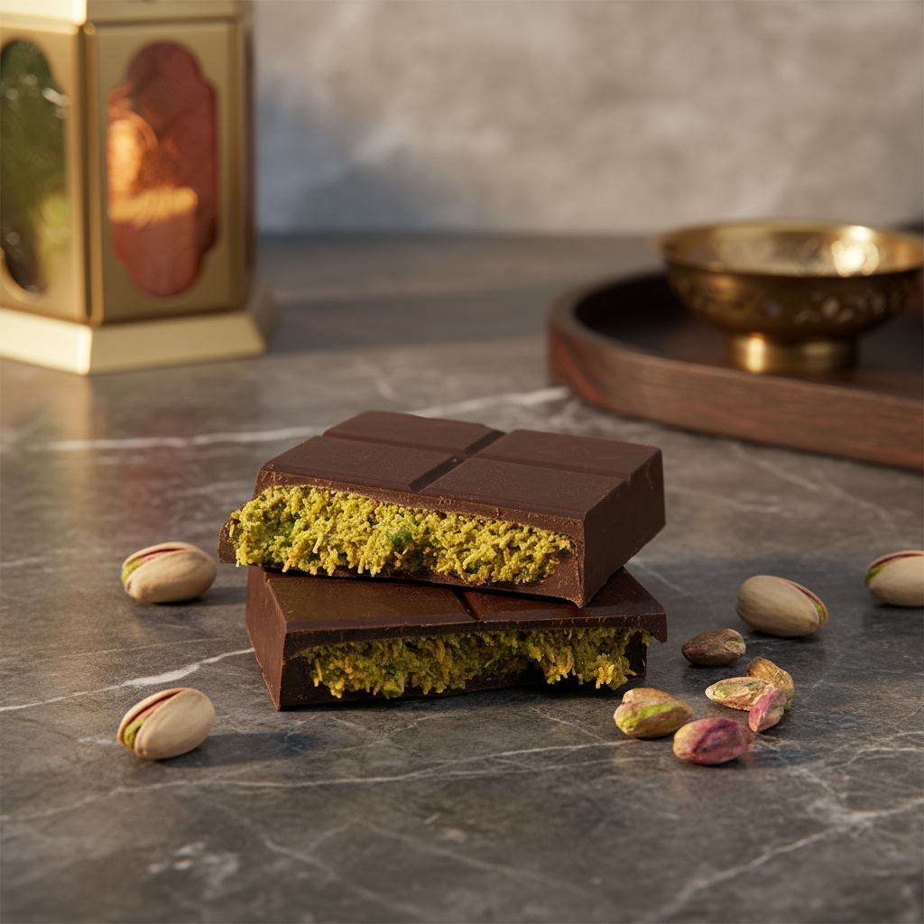 تجمع بين عجينة الكنافة المقرمشة وحشوة الفستق الغنية، وتُغطى بطبقة من الشوكولاتة الداكنة الفاخرة التي توازن الحلاوة بدقة، لتمنحك طعمًا راقيًا ومتوازنًا لا يُقاوم.