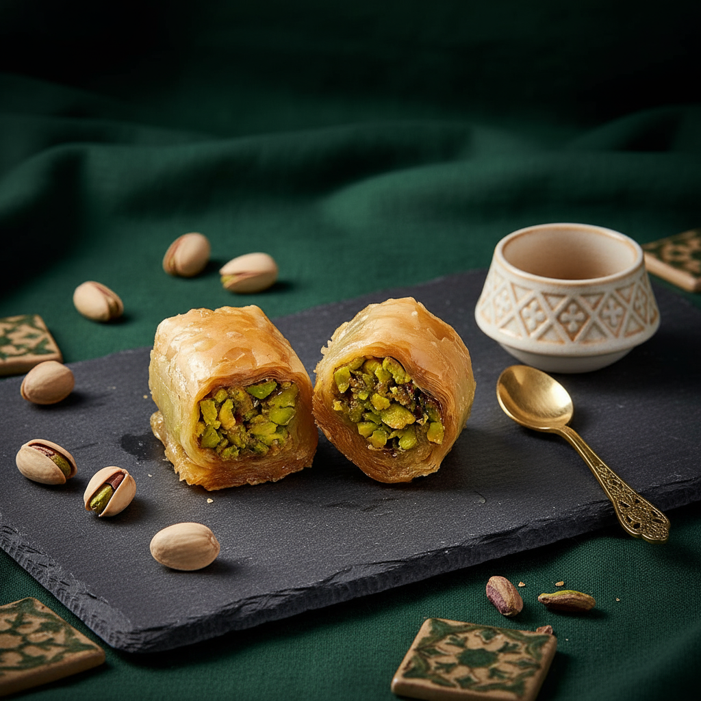 بقلاوة محشوة بالفستق – تحفة تجمع بين العجينة المقرمشة والحشوة الغنية بنكهة الفستق الفاخر.